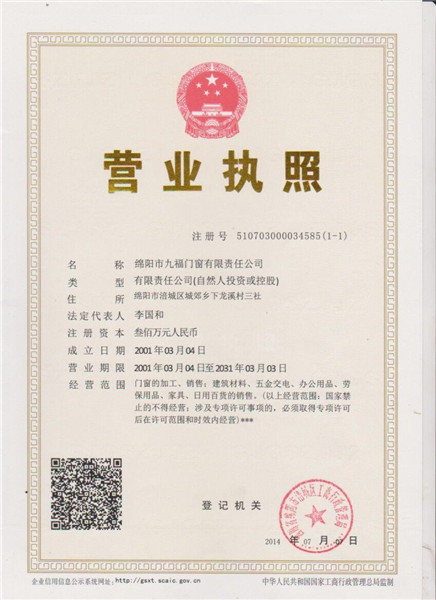 綿陽市九福門窗有限責任公司座落于中國西部美麗的科技城----綿陽。是川內研發生產新型換代,生態環保室內門和家具的企業之一。我公司生產的產品,綠色環保、堅固耐磨,抗擊性高、防潮阻燃、不含苯、不變形,連續六年經四川省綿陽市質量技術監督局抽檢合格,符合中華人民共和國行業標準的各項要求。2011年,被中國產品培育委員會和中國品牌調查統計中心推介為《質量·服務·信譽AAA企業》、《中國綠色環保產品》和《誠信經營、消費者滿意產品》;注冊商標“金九!迸葡盗挟a品,在全國品牌評選推廣活動中,經中國品牌認證委員會和中國產品質量評選中心審核,于2012年2月入選為《中國****品牌》…>>更多